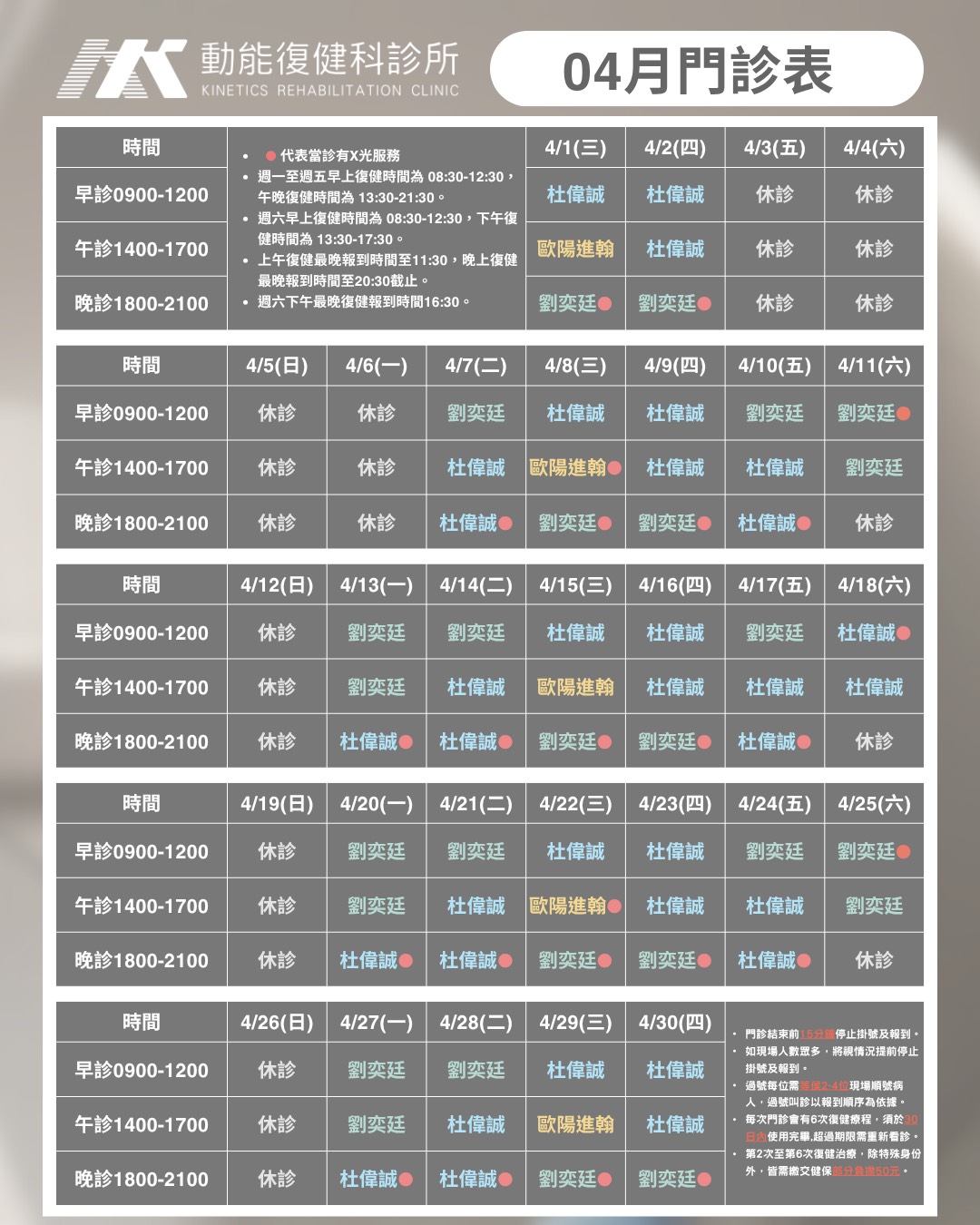 4月份門診時間,歡迎提早安排看診或復健療程